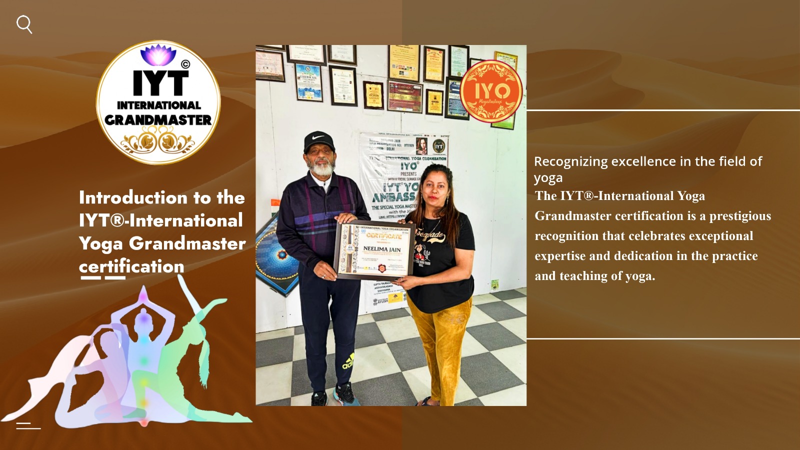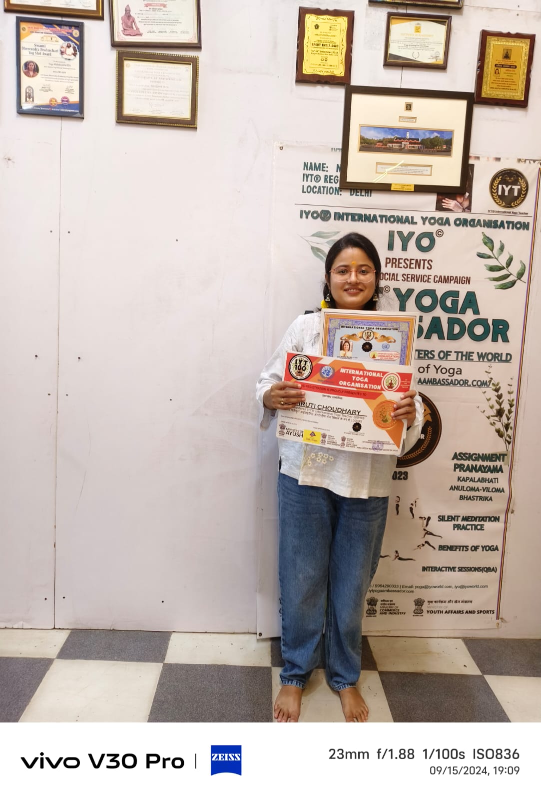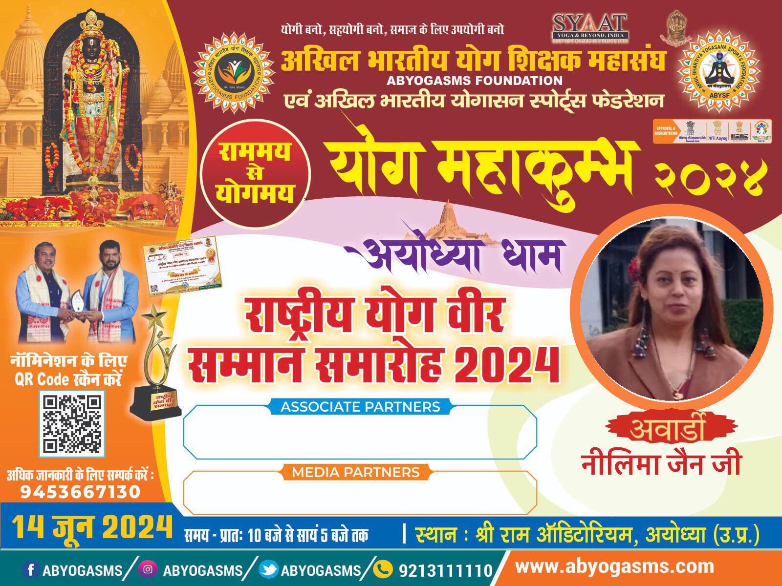Our Visual Journey Awards and Achievements IYT®International Yoga Grandmaster Award Lifetime Achievement Award 2024 Swami Vivekanand Lifetime Achievement Award 2024 Yoga Meteor Awards 2025 National Yogveer Award 2024 International Yogini Awards 2024 News Author Award 2023 National Leadership Award Sri Sri School of Yoga 350 Hours Teacher Training Certificate The Art of Living Yoga Teacher Training Yoga Instructor 2019 Yoga Certificate 2018 The Art of Living Yoga 2019 PG IYT Certificate IYT Yoga Ambassador Award 2022 Neurotherapy Certificate 2018 100 Hours Prenatal Yoga Teachers Training Course 2022 Yoga Shivir 2019 World Record Attempt Yoga Certification Board 2019 IYT Yoga Ambassador IYO Certificate Yoga Ambassador Yoga for All Yoga Practice Mahila Shashakti Samaan International Yogini Awards Best Yoga Center Award Awards of Neelima Jain Awards of Neelima Jain